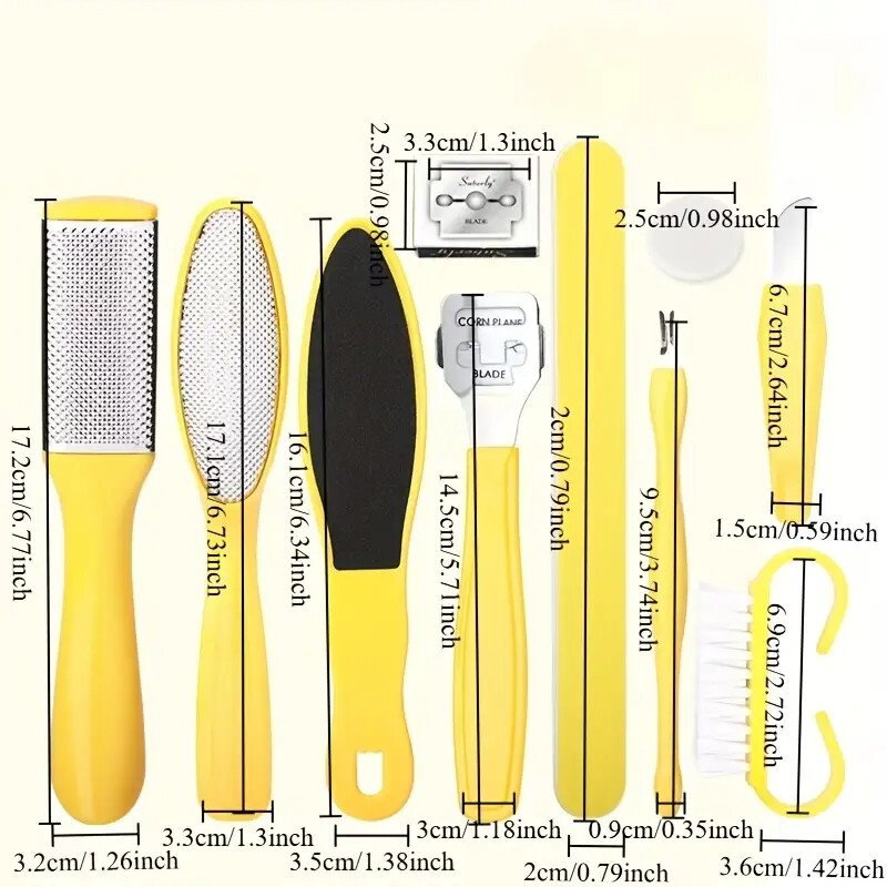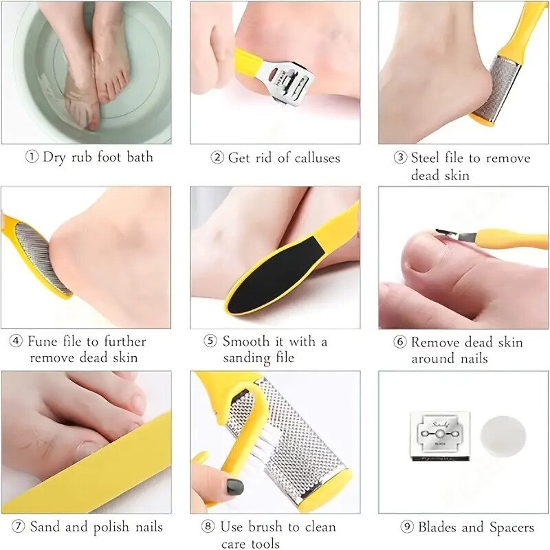 ✨ احصل على أقدام ناعمة وسلسة مع مجموعة العناية بالقدم متعددة الوظائف، المصممة لإزالة الجلد الميت، النسيج العنيد، الذرة، والأظافر السميكة بأمان وبدون ألم.